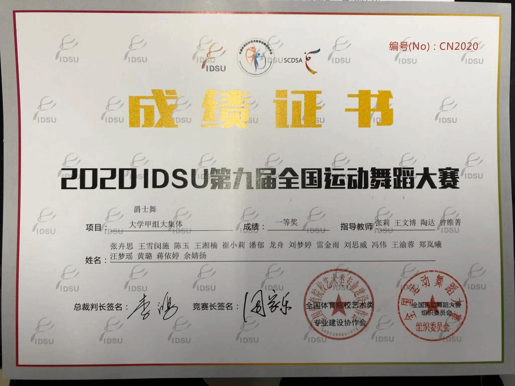 为响应教育部进一步加强学校体育“健康第一”和学校美育“坚持以美育人、以文化人,提高学生审美和人文素养”的要求,大力推进运动舞蹈健身课程进校园,2020年全国青少年运动舞蹈艺术教育成果展演暨2020第九届全国运动舞蹈大赛(云端赛)于12月5日至12月6日举行。由人文艺术学院17名学生组成的参赛队历时数月精心编排和刻苦训练,在普通院校组大集体爵士舞比赛中荣获一等奖,这也是人文艺术学院连续八年参加该项赛事并获得冠军。