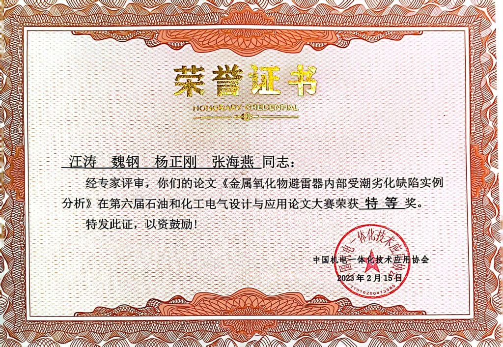 近日,第七届全国石油和化工电气技术大会在四川成都圆满落幕。经过专家组评审,我校电气工程学院学生汪涛及指导教师魏钢、张海燕,与中石油重庆天然气净化总厂杨正刚共同撰写的参赛论文《金属氧化物避雷器内部受潮劣化缺陷实例分析》荣获大赛特等奖。