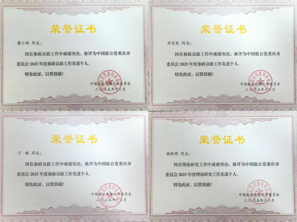 近日,致公党重庆市委会对2025年度先进集体和先进个人进行表彰,我校致公党支部获评致公党重庆市委会“2025年度优秀基层组织”。支部党员刘宝发、黎小刚、丁皓荣获“2025年度参政议政工作先进个人”称号,胡湫明荣获“2025年度理论研究工作先进个人”称号。