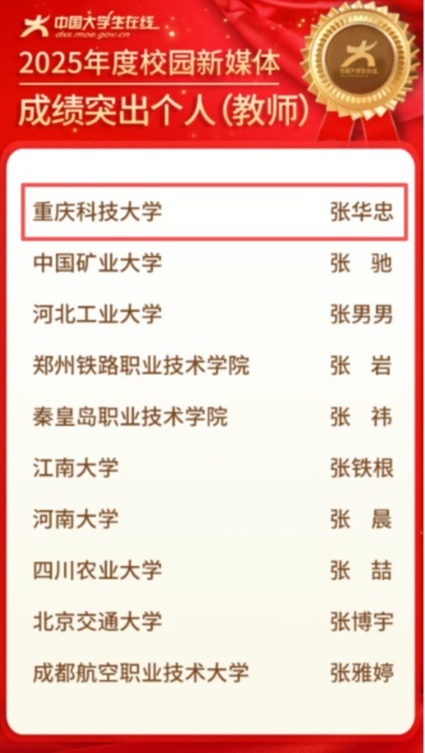 近日,教育部中国大学生在线公布2025年度校园新媒体表彰名单,我校凭借优质内容产出与高效师生互动,荣获“校园新媒体互动百强单位”,党委宣传部张华忠获评“校园新媒体成绩突出个人(教师)”。