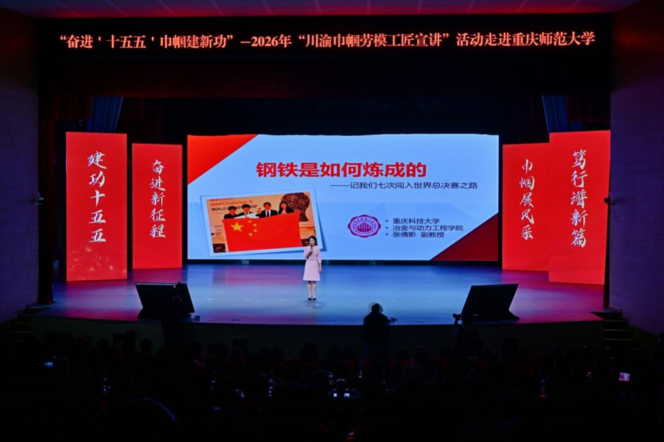 3月12日,由重庆市总工会、四川省总工会主办的2026年“川渝巾帼劳模工匠宣讲”活动在重庆师范大学校友会堂演出厅举行。重庆市总工会党组书记、副主席余季平,重庆市总工会党组成员、副主席申雄,四川省总工会二级巡视员孙家洪出席活动。我校冶金与动力工程学院教师、重庆市先进工作者张倩影作为川渝巾帼劳模工匠代表受邀登台宣讲。