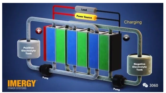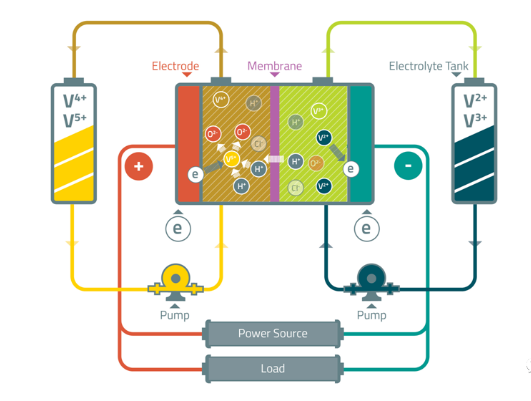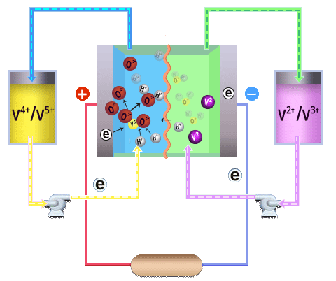 钒液流电池储能安全寿命长,适合新能源电站储能。电能以化学能的方式存储在不同价态钒离子的硫酸电解液中,通过外接泵把电解液压入电池堆体内,在机械动力作用下,使其在不同的储液罐和半电池的闭合回路中循环流动。采用质子交换膜作为电池组的隔膜,电解质溶液平行流过电极表面并发生电化学反应,通过双电极板收集和传导电流,从而使储存在溶液中的化学能转换成电能。可逆的反应过程使钒电池顺利完成充电、放电和再充电。