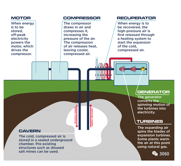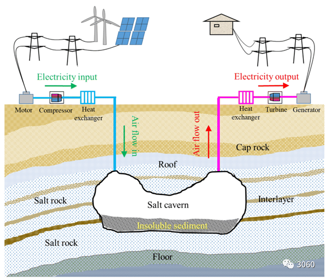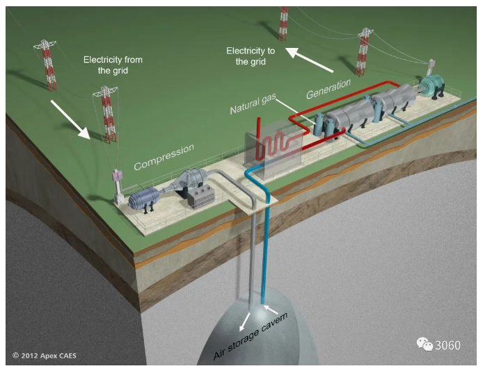 压缩空气储能将成为大规模储能的重要补充。压缩空气储能是一种基于燃气轮机发展而产生的储能技术,以压缩空气的方式储存能量。储能时段,压缩空气储能系统利用风/光电或低谷电能带动压缩机,将电能转化为空气压力能,随后高压空气被密封存储于报废的矿井、岩洞、废弃的油井或人造的储气罐中;释能时段,通过放出高压空气推动膨胀机,将存储的空气压力能再次转化为机械能或者电能。压缩空气主要由压缩系统、膨胀系统、发电以及储气罐四大核心部分组成。中国已建成1.5,10,100MW先进压缩空气储能示范项目。