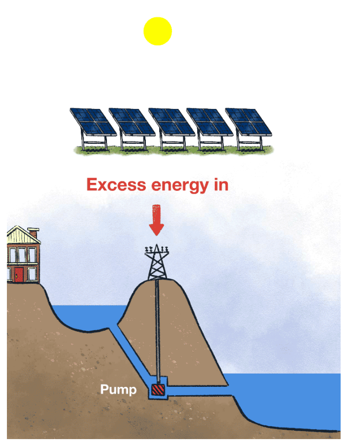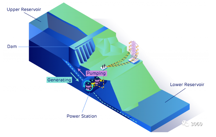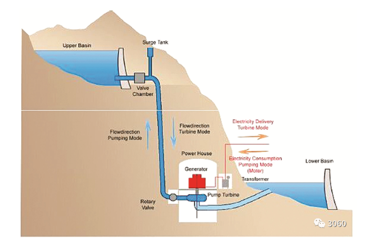 抽水蓄能是现今发展成熟且具规模的储能技术。抽水蓄能电站一般由上水库、下水库和可逆式水泵水轮机组成。用电低峰期时,将可逆式水泵水轮机作为水泵,利用低价值电能将水从下水库抽至上水库,储存水的势能;用电高峰期时则将可逆式水泵水轮机作为水轮机,在上水库开闸放水,将水的势能转换为高价值电能。抽水蓄能具有技术优、成本低、寿命长、容量大、效率高等优点,可适应各种储能周期需求,系统循环效率可达70%~80%。抽蓄电站坝体可使用100a左右,预计电机等设备使用年限为40~60a。截至2021年底,中国储能装机总规模达到46.1GW,其中抽水蓄能占比86.3%。