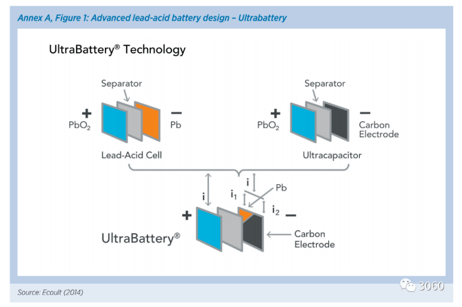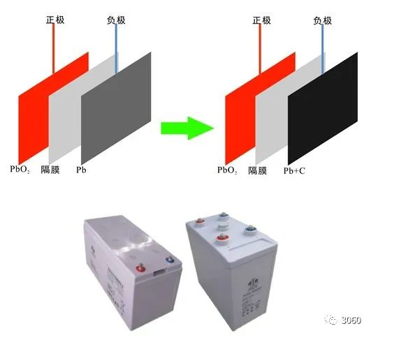 铅炭电池是一种电容型铅酸电池,是从传统的铅酸电池演进出来的技术。普通铅酸电池的正极活性材料是氧化铅(PbO2),负极活性材料是铅(Pb),若把负极活性材料Pb全部换成活性炭,则普通铅酸电池可变成混合电容器;若把活性炭混合到负极活性材料Pb中,则普通铅酸电池可变成铅炭电池。铅炭电池同时具有铅酸电池和电容器的特点,即拥有超级电容能瞬间大容量充电的优点,也发挥了铅酸电池的比能量优势,充放电性能好、电池寿命也长于铅酸电池。中国高性能铅炭电池在微网储能项目中也有应用。