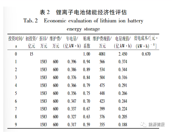 锂离子电池储能电站的经济性评估(表2),按100MW项目初始投资成本1.5元/(W・h),年运维成本0.06元/W,寿命为9a,残值为5%,每年运行次数500次,放电深度90%,储能循环效率88%,寿命终止容量75%等条件,对锂离子电池储能电站进行财务经济性评价建模,测算储能度电成本约为0.67元/(kW・h)。