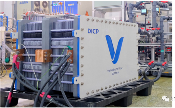 全钒液流电池系统中,钒电解液全生命周期内不会失效变质,理论上总钒量不会发生变化,易于回收利用,价值较高。钒液流电池具有寿命长、安全性好、输出功率大、储能容量大且易于扩展等特点,寿命达15~20a,适合用于风电、光伏电站储能,满足其频繁充放电、大容量、长时间储能需求。但是,反液流电池能量密度低,体积、质量远大于其他电池,需要5°~40°的温度环境。中国钒液流电池已在智能电网、通信基站、偏远地区供电、可再生能源及削峰填谷等项目中成功应用,并建成大连10MW/400(MW・h)的全球最大钒液流储能项目。