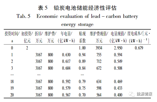 铅炭电池储能电站经济性评估(表5),按10MW/200(MW・h)项目初始投资成本1元/W,年运维成本0.04元/W,寿命为5a,循环次数可达3000次以上,残值为5%,每年运行次数600次,放电深度70%,储能循环效率75%等条件,对铅炭电池储能电站进行财务经济性评价建模,测算储能度电成本约为0.679元/(kW・h)。