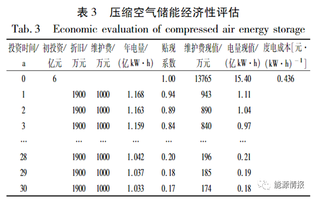 压缩空气储能电站经济性评估(表3),按100MW/400(MW・h)项目初始投资成本6元/W,年运维成本0.1元/W,寿命为30a,残值为5%,每年运行次数400次,放电深度100%,储能循环效率73%等条件,对压缩空气储能电站进行财务经济性评价建模,测算储能度电成本约为0.436元/(kW・h)。