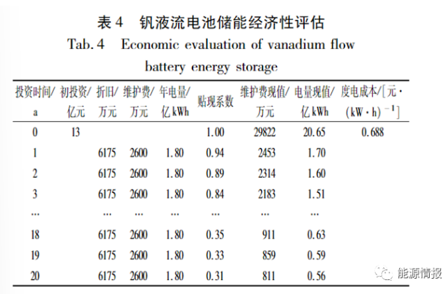 钒液流电池储能电站经济性评估(表4),由于尚未规模化商用,且受制于设备、产能以及高额的前期投入,目前钒电池初始成本约为锂电池的3倍。按10MW/400(MW・h)项目初始投资成本13元/W,年运维成本0.065元/W,寿命为20a,玄幻次数可达12000次以上,残值为5%,每年运行次数600次,放电深度100%,储能循环效率70%等条件,对钒液流电池储能电站进行财务经济性评价建模,测算储能度电成为约为0.688元/(kW・h)。
