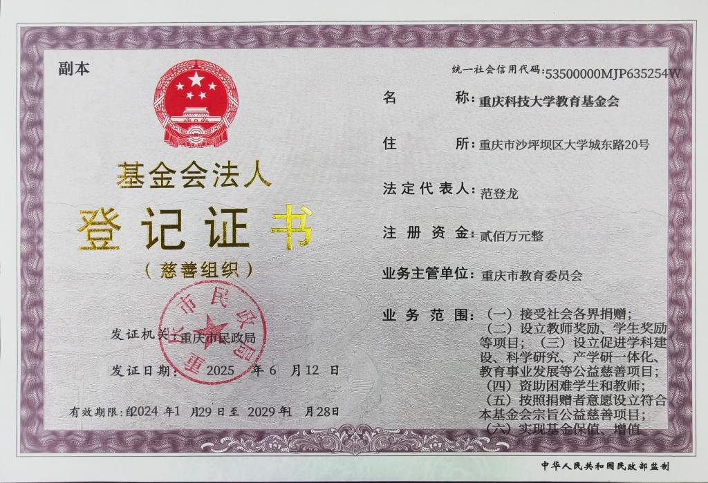 重庆科技大学教育基金会成立于2024年1月,是在重庆市民政部局依法注册登记、具有独立法人资格的非营利性慈善组织,属于非公募基金会。基金会原始基金为200万元。